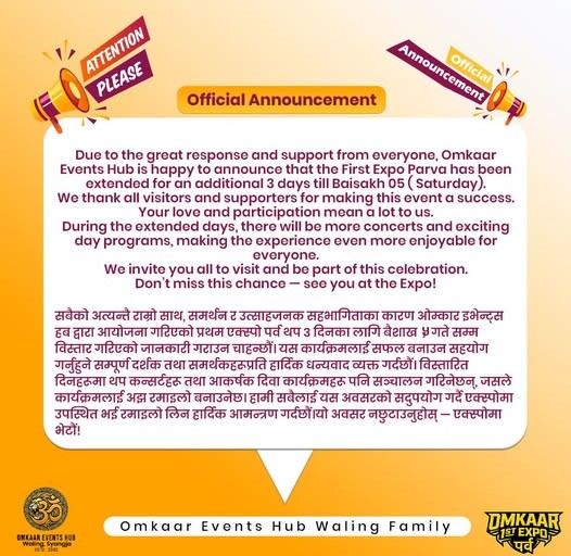 नयाँवर्षलाई लक्षित गरी ओमकार इभेन्ट हबद्धारा आयोजना गरिएको फस्ट एक्स्पो पर्वको मिति थपिएको छ । दर्शकहरुको सहभागिता तथा मागको आधारमा बैशाख ५ गतेसम्मका लागि मिति थप गरिएको एक्स्पो आयोजक ओमकार इभेन्ट हबकका प्रबन्धक नवराज पौडेलले जानकारी दिनुभयो । गत चैत्र २६ गतेबाट शुरु गरिएको महोत्सव यसअघि बैशाख २ गतेसम्म सञ्चालन हुने भनिएकोमा दर्शकहरुको उत्साहजनक सहभागिता र मागका आधारमा थप ३ दिन थप गरेर बैशाख ५ गतेसम्म सञ्चालन गरिने प्रबन्धक पौडेलले बताउनुभयो ।