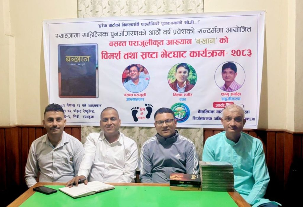 युवा लेखक एवम् पत्रकार वसन्त पराजुलीद्वारा लिखित पछिल्लो उपन्यास ‘बखान’ माथि स्याङ्जाको वालिङमा विमर्श गरिएको छ । वैकल्पिक बाटो पृथक पाइला सिर्जनात्मक अभियान २०७६, स्याङ्जाको आयोजनामा आइतबार वालिङस्थित नेचुरल भ्यू पोइन्ट रेस्टुरेन्टमा उक्त विमर्श कार्यक्रम सम्पन्न भएको हो ।