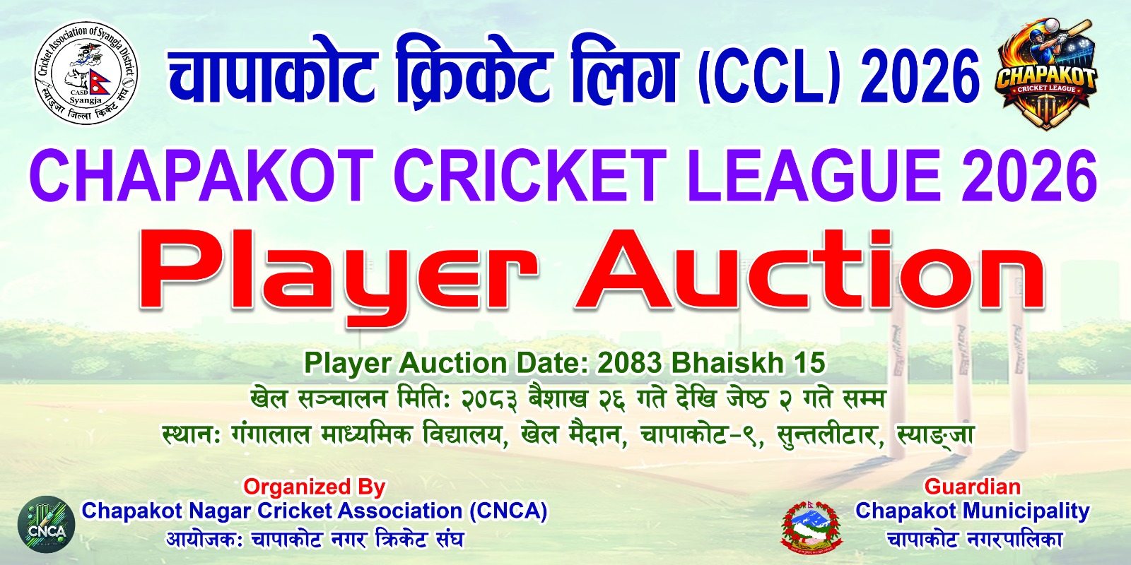 स्याङ्जाको चापाकोटमा चापाकोट क्रिकेट लीग २०८३ हुने भएको छ । चापाकोट नगर क्रिकेट संघको आयोजना तथा चापाकोट नगरपालिकाको संरक्षकत्वमा यही बैशाख २६ देखि जेठ २ गतेसम्म गंगालाल माविको खेलमैदानमा लीग सञ्चालन हुने भएको हो । आईसिसीको नियम अनुसार खेलाईने उक्त लीगमा प्रथम हुनेले रु. एक लाख १० हजार र द्वितीय हुने समूहले रु. ६० हजार नगद पुरस्कारसहित शिल्ड, मेडल र प्रमाणपत्र प्राप्त गर्ने आयोजक चापाकोट क्रिकेट संघका अध्यक्ष प्रेमनारायण रेग्मीले जानकारी दिनुभयो । पाँच समूहको सहभागिता रहने उक्त प्रतियोगिता टिट्वान्टी राउण्ड रोविन फम्र्याटमा खेलाईने भएको हो ।